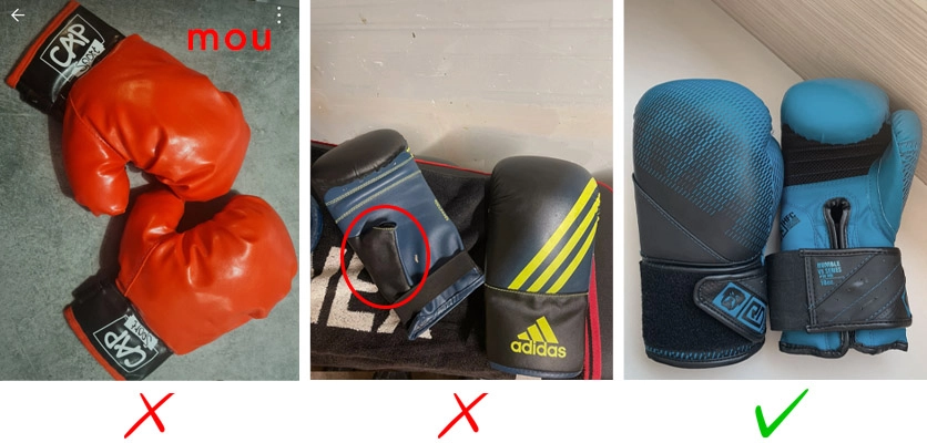 – il ne faut pas des gants mous ni des gants de mma (plus petit et ouvert)